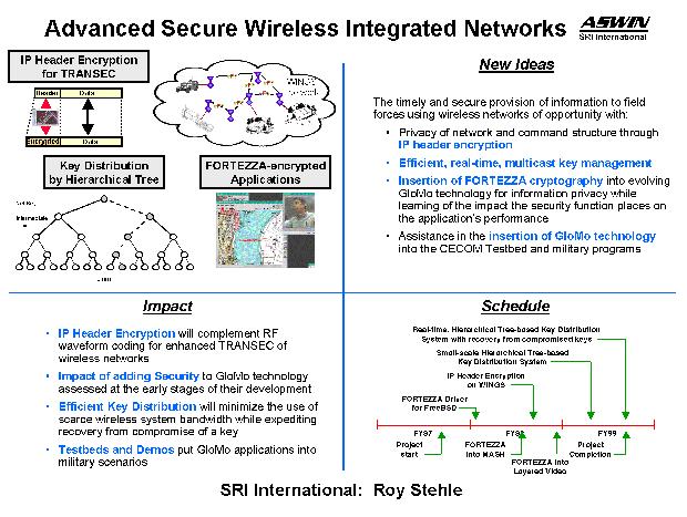 Encryption of the Internet Protocol (IP) header information will prevent the discovery of network topology and command hierarchy from analysis of the routing information. This transmission security (TRANSEC) measure is complementary to the benefits of radio frequency waveform encoding to limit the detectability of the transmitted signal. The Wireless Internet Gateway System (WINGS) being developed by the University of California at Santa Cruz (UCSC) and Rooftop Communications (Rooftop) has been selected as the protocol and hardware to be protected by FORTEZZA cryptography. Cryptographic security will also be provided at the application level by incorporating FORTEZZA security into the voice, video, and mediaboard functionality of MASH, developed at the University of California at Berkeley (UCB). Encryption of multilayer video will allow multicast conferencing users to obtain performance commensurate with their available communications bandwidth. A multicast cryptographic key management system is being developed utilizing research on hierarchical topologies from the National Security Agency (NSA). Besides matching the hierarchical nature of the military command structure, this approach is primarily of interest because it permits the rapid distribution of session keys for a large number of users in a manner that efficiently uses the bandwidth-limited wireless medium. The GloMo Testbed has evolved from the initial InfoTech demonstration testbed with nodes at CECOM, Fort Monmouth, NJ, and at SRI, Menlo Park, CA. The testbed will be enhanced through the integration of technology from the GloMo-supported projects. SRI will also conduct research on transitioning wireless and security technology into such programs as PCS for the Soldier and the First Digitized Division. |
