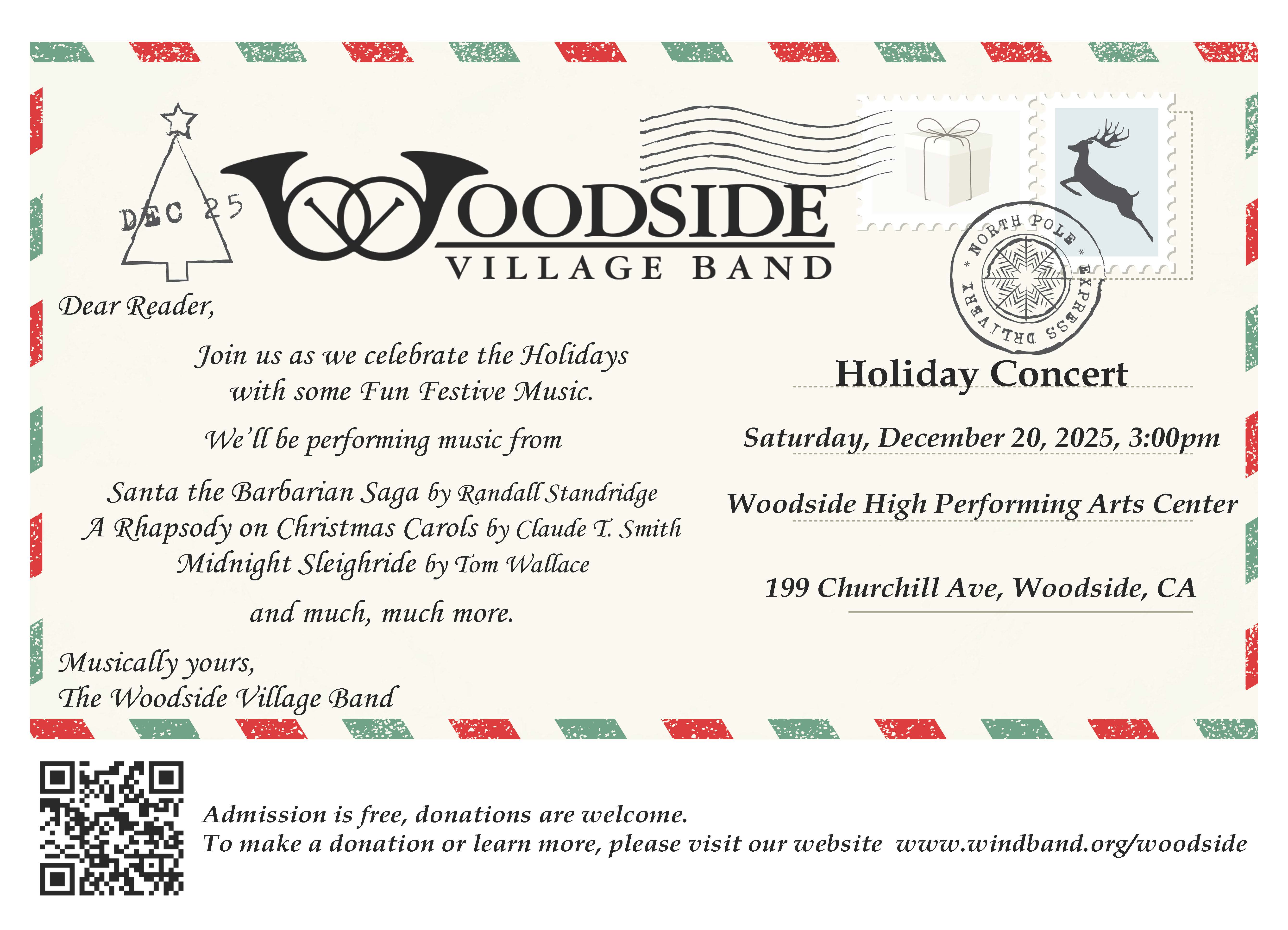 The Woodside Village Band is adding musicians to our group. We are welcoming members in all of our sections. Auditions are not required, just a love of making music with the group. Additional information about the band, our rehearsal venue, and history can be found below.